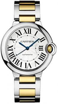 Silver dial enhanced by blued-steel sword-shaped hands. Silver-tone stainless steel case with a silver-tone stainless steel with 18kt yellow gold band. Automatic movement. 30 meters / 100 feet water resistance. Fixed bezel. Scratch Resistant Sapphire crystal. Solid caseback. Deployment clasp. Pull / Push crown. Case size 36 mm x 12 mm. Band 20 mm x long. Cartier W2BB0012 Ballon Bleu Watch.