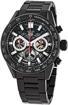 A black ceramic edition for this TAG Heuer Carrera with Heuer 02 Manufacture movement. Black ceramic case, black ceramic tachymeter-scale bezel, lugs and bracelet. Super-LumiNova® indexes and hour and minute hands make for at-a-glance reading in low light. The automobile industry are used throughout the design. Open-working reveals the inner workings of the in-house manufactured movement, the Heuer 02, with a stunning 80 hours of power reserve. Size 45 mm Thickness 15.65 mm Lugs Distance 22.50 mm Water resistance 100 m Case Ceramic Bezel Fixed Bezel Ceramic Crown Black PVD coated steel Caseback Sapphire - Ceramic Material Ceramic Finishing Sand-Blasted Buckle Folding Clasp - Sand Blasted Steel Finishing Vertical Brushed Color Black Index Applied Caliber Calibre HEUER02 Automatic Movement Automatic Chronograph In-house movement Yes Power reserve (hours) 80 H Balance Frequency 28800 (4Hz) Functions Hours, Minutes, CBG2A90.BH0653