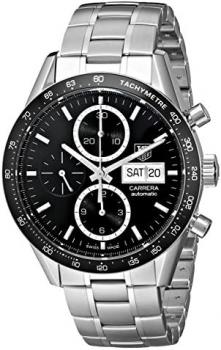 Stainless steel case with a stainless steel bracelet. Fixed black aluminum with tachymeter bezel. Black dial with luminous hands and index hour markers. Minute markers around the outer rim. Dial Type: Analog. Luminescent hands and markers. Day of the week and date display at the 3 o'clock position. Chronograph - sub-dials displaying: three - 60 second, 30 minute and 12 hour. Automatic movement. Calibre 16 engine. Scratch resistant sapphire crystal. Pull / push crown. Solid case back. Case diameter: 42 mm. Case thickness: 17 mm. Round case shape. Fold over deployment clasp. Water resistant at 100 meters / 330 feet. Functions: chronograph, date, day, hour, minute, second. Luxury watch style. Watch label: Swiss Made. Tag Heuer Carrera Automatic Chronograph Black Dial Stainless Steel Men's Watch CV201AGBA0725.