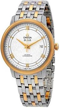 Silver dial. Silver-tone stainless steel case with a silver-tone stainless steel with 18kt yellow gold links band. Automatic movement. 30 meters / 100 feet water resistance. Fixed bezel. Hidden Fold Over clasp. Case size 39.5 mm x 10 mm. Omega 424.20.40.20.02.001 De Ville Prestige Watch.